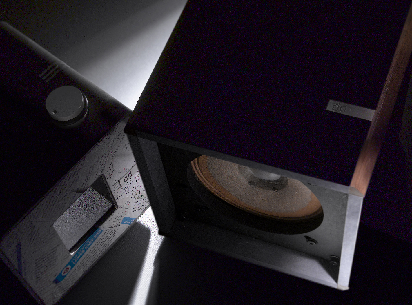 実は、このブラック MDFは、なかなか難しい素材です。金属や樹脂ほど均一な素材ではありません。その不均一は表面に現れます。手で触ったり、ヤスリをかけたりと、その経過が表面に蓄積して表情になります。その表情が製品化しようとする時に不均一な姿を表します。絵画などでは、わざと不均一な表情を苦労して作りますが、このMDFの個性をどう扱うか悩ましい問題です。工業製品的でないからです。デザインを考える時、製品の出来上がりを想像します。量産品でもバラツキは出ますが、普通は均一を目指します。塗装すれば均一性は出てきますが、この個性は残した方が良さそうに思えます。無垢板を使うのと同じかもしれません。そういう意味で実に奥深い素材に感じます。ヴィンテージユニットを取り付けて遊ぶのですから、それなりの表情が箱にあって不自然ではないです。やはり表情を活かそう。