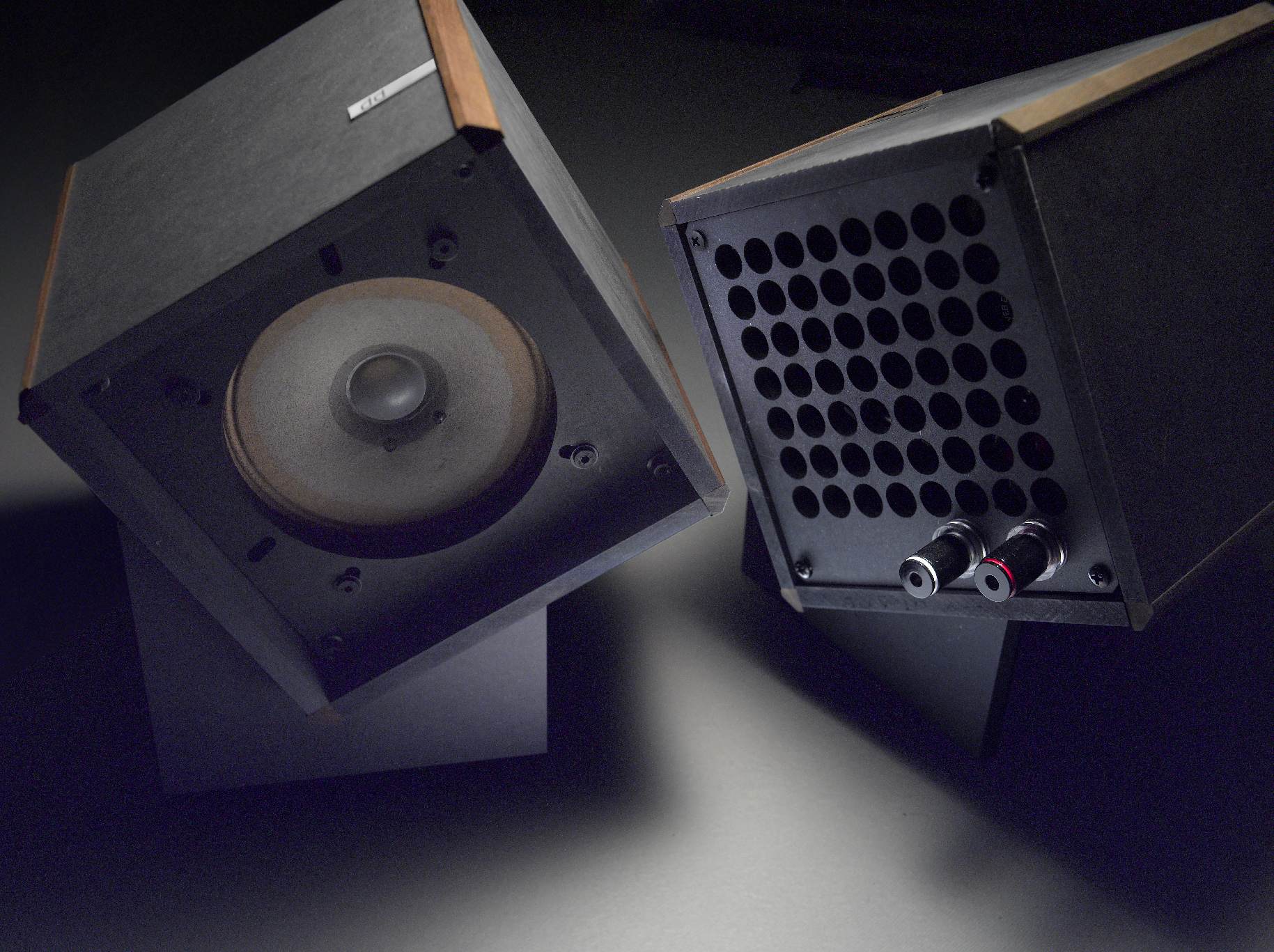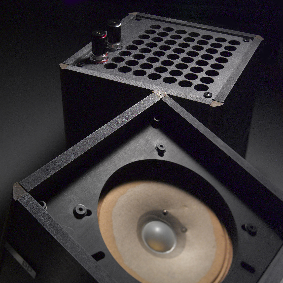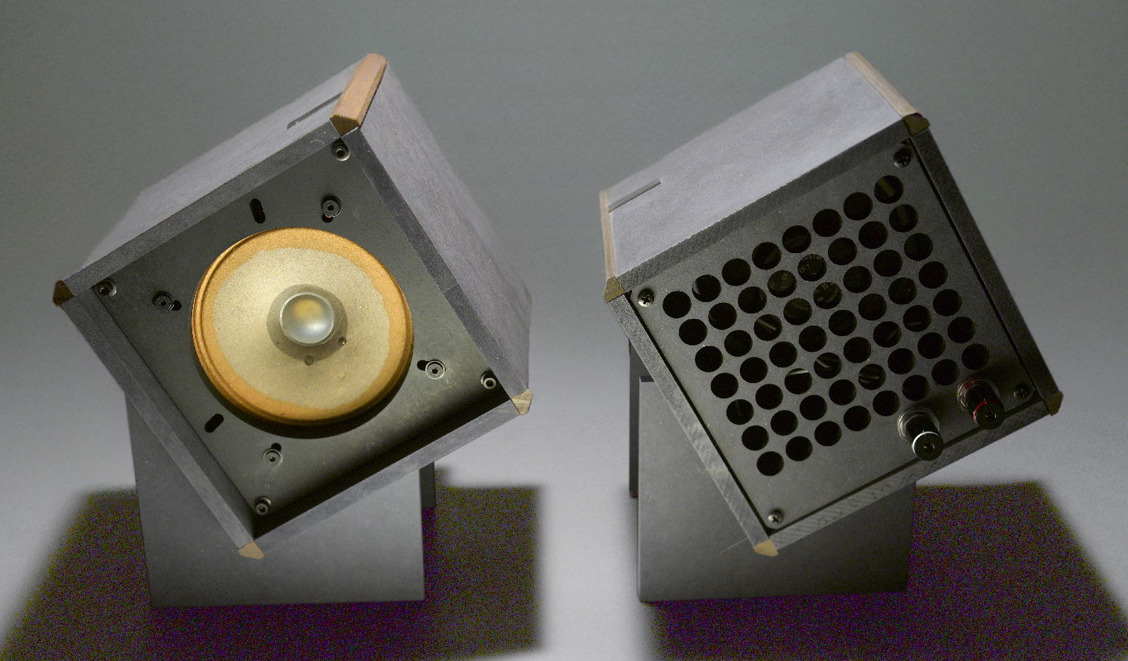 普通、デザイン的には素材を複合させた方が完成度が高く見えます。車だと、ガラスやゴム製のタイヤ、そしてクロームメッキパーツなど、色々な素材で構成されてあの質感が生まれます。MDFのみだとなあ・・。そうは言っても、バインディングポストやスピーカーユニットなど別素材が入りますので複合素材は必然ですが。それで今回は、ブラックMDFと箱の四隅に木の無垢材を入れ、ステンレスの銘板を組み合わせて、素材を複合させています。