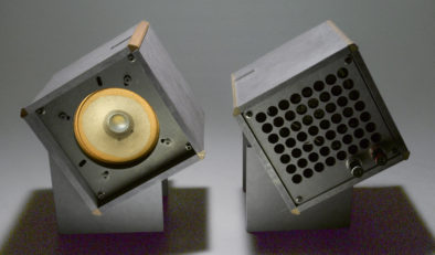 後面は、パンチングのパターンで13cmのコーンとほぼ同じ面積が解放されています。穴が無いと、 容量が小さな密閉箱になり低域が不足し、詰まってボンボン弾み音質が変わってしまいます。バスレフは付いてないので、箱で音を作ることもなく、ユニットの個性を楽しむことができます。バッフルを交換して、別ユニットを簡単に楽しめるのは、以前デザインした平面バッフルと同じコンセプトです。ただ板厚が9mmあるので、バスレフ効果が若干あるのかも。後方に壁があれば、音によりまとまりが出て聴きやすい感じがします。とにかくコンパクトなのが良いです。