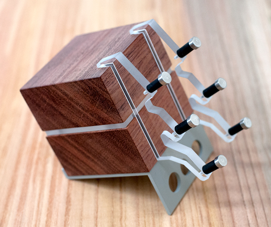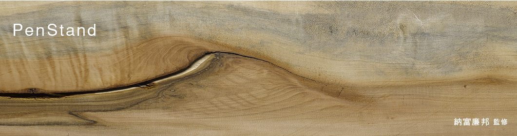 万年筆スタンドは、左右に銘木を配置し景色を楽しめるデザインと木を縦に重ねたモダンなデザインの二種類があります。