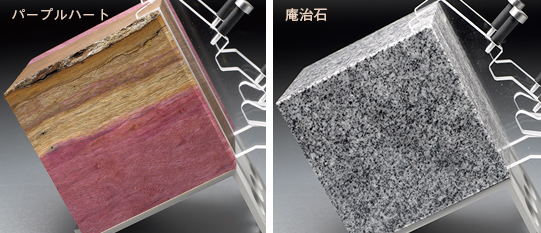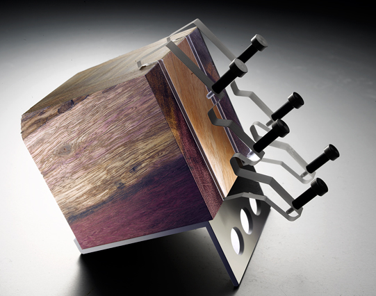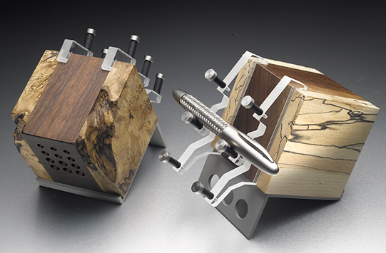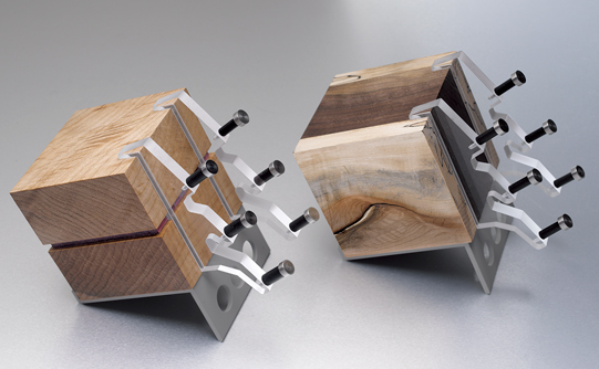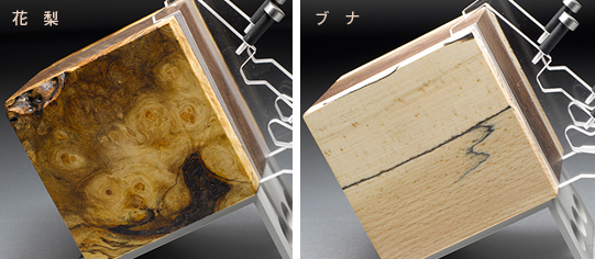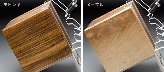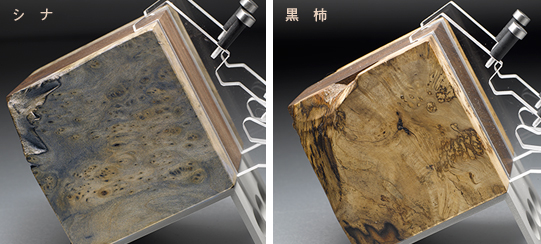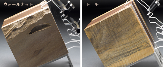 どちらも高品質な木材を使用し、手加工で作り上げます。使われる木は、ウォールナット、メープル、ブナ、栃、白樫、花梨、パープルハート、ブビンガ、黒柿ほか、木の美しさにこだわり厳選した素材を使用し杢を活かしワックスで仕上げています。美しいカタチが出た場合、樹皮の部分も使用しています。またダイナミックな動きがある割れなども積極的に取り入れて本体を製作しています。